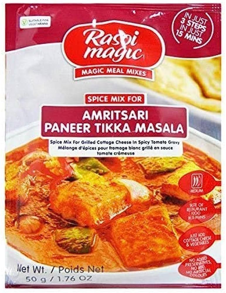 Rasoi Magic - Amritsari Paneer Tikka 50g: A spice mix specifically designed to recreate the authentic flavors of Amritsari Paneer Tikka, a popular North Indian dish. This Rasoi Magic spice mix offers a blend of aromatic spices and herbs that enhance the taste of paneer tikka. Simply marinate the paneer (Indian cottage cheese) with this spice mix, grill or cook, and enjoy the delicious and smoky flavors of Amritsari Paneer Tikka in the comfort of your own home.